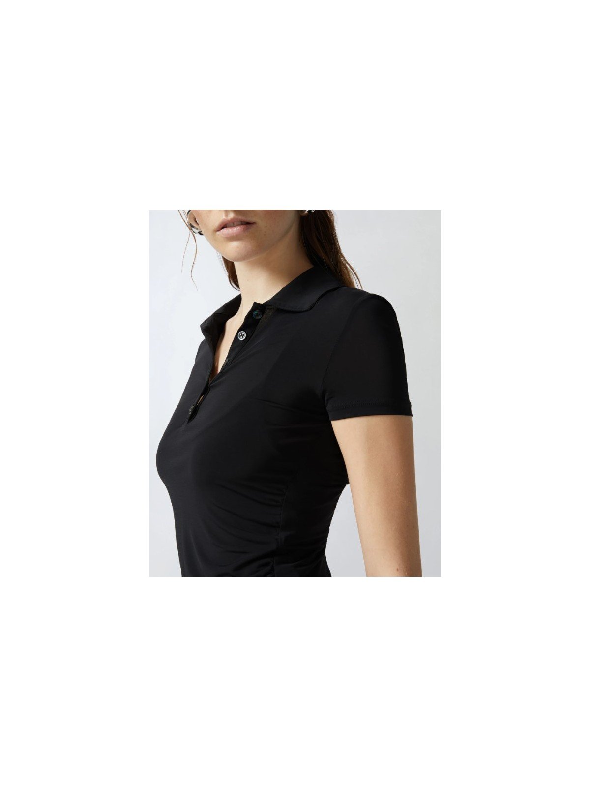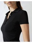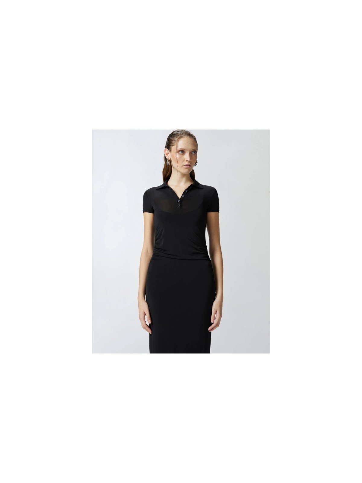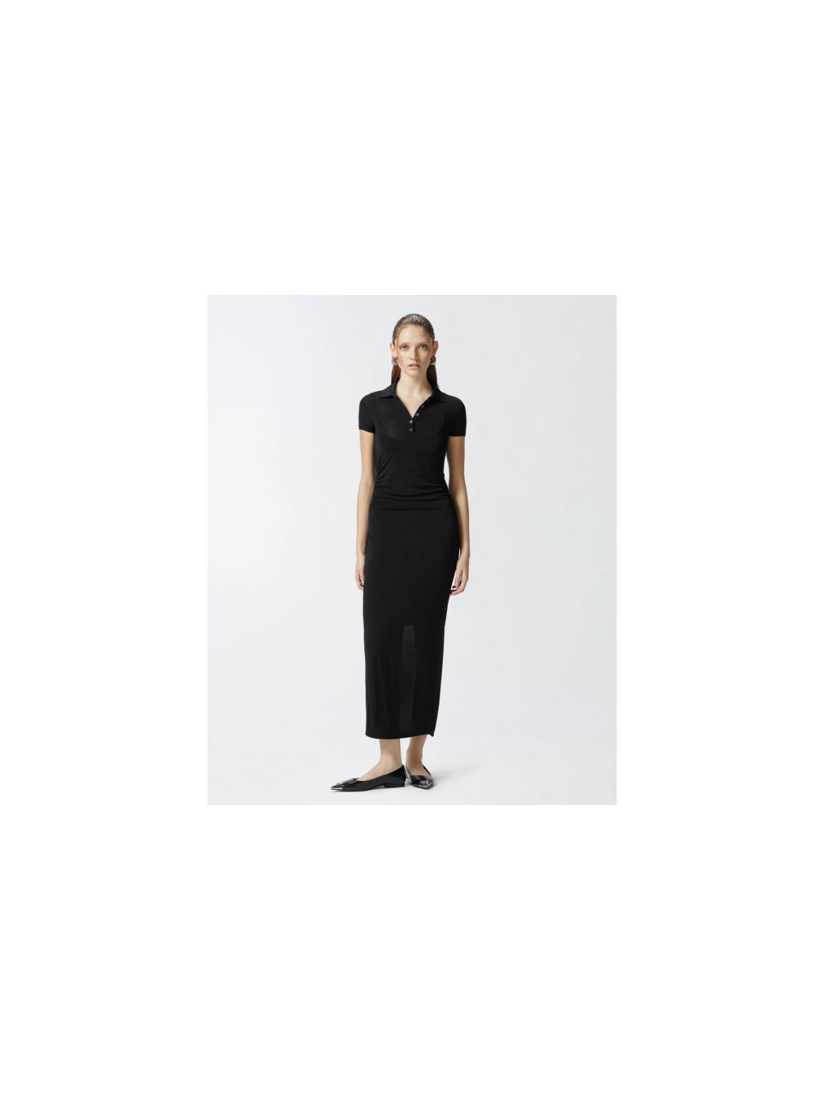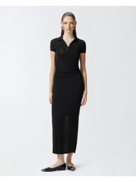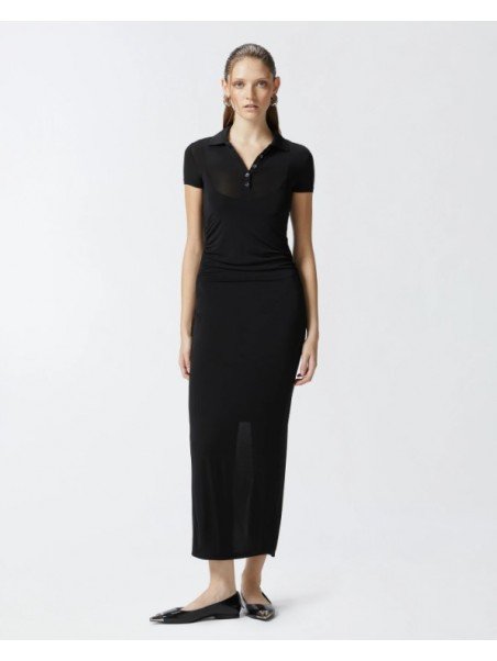 Abito lungo in leggero jersey crêpe di viscosa dall'effetto matte: si tratta di una particolare lavorazione del tessuto che conferisce alla superficie un aspetto opaco e semitrasparente. La linea aderente è completata da colletto a polo e spacco centrale al fondo sul retro, chiuso da zip invisibile per personalizzarne la profondità.