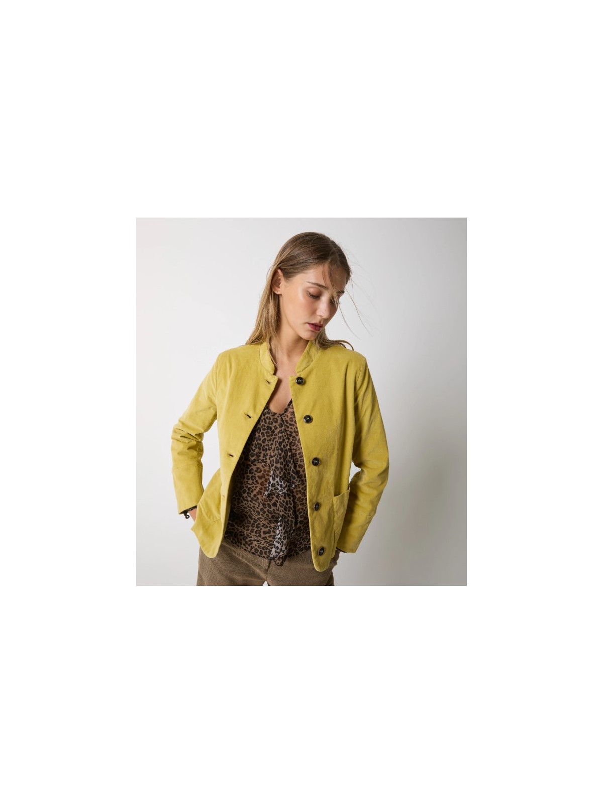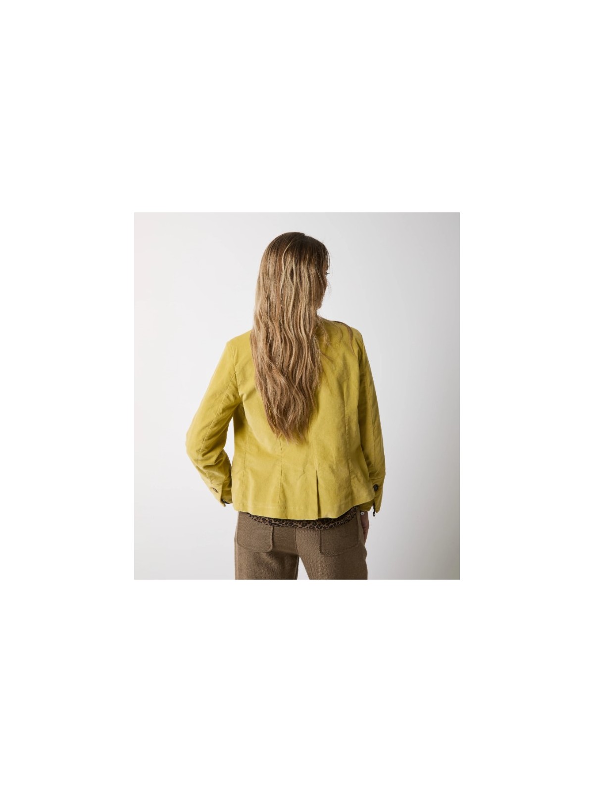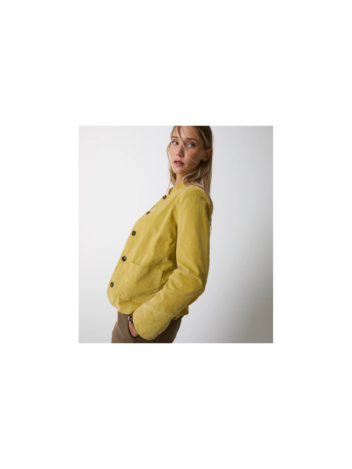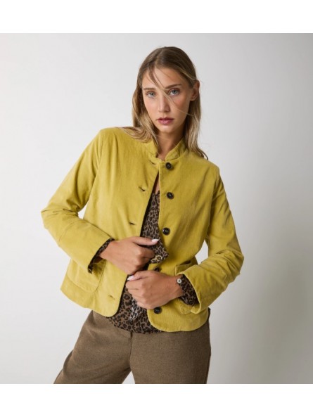 Scegli la giacca realizzata in velluto di cotone stretch dalla texture morbida e luminosa.