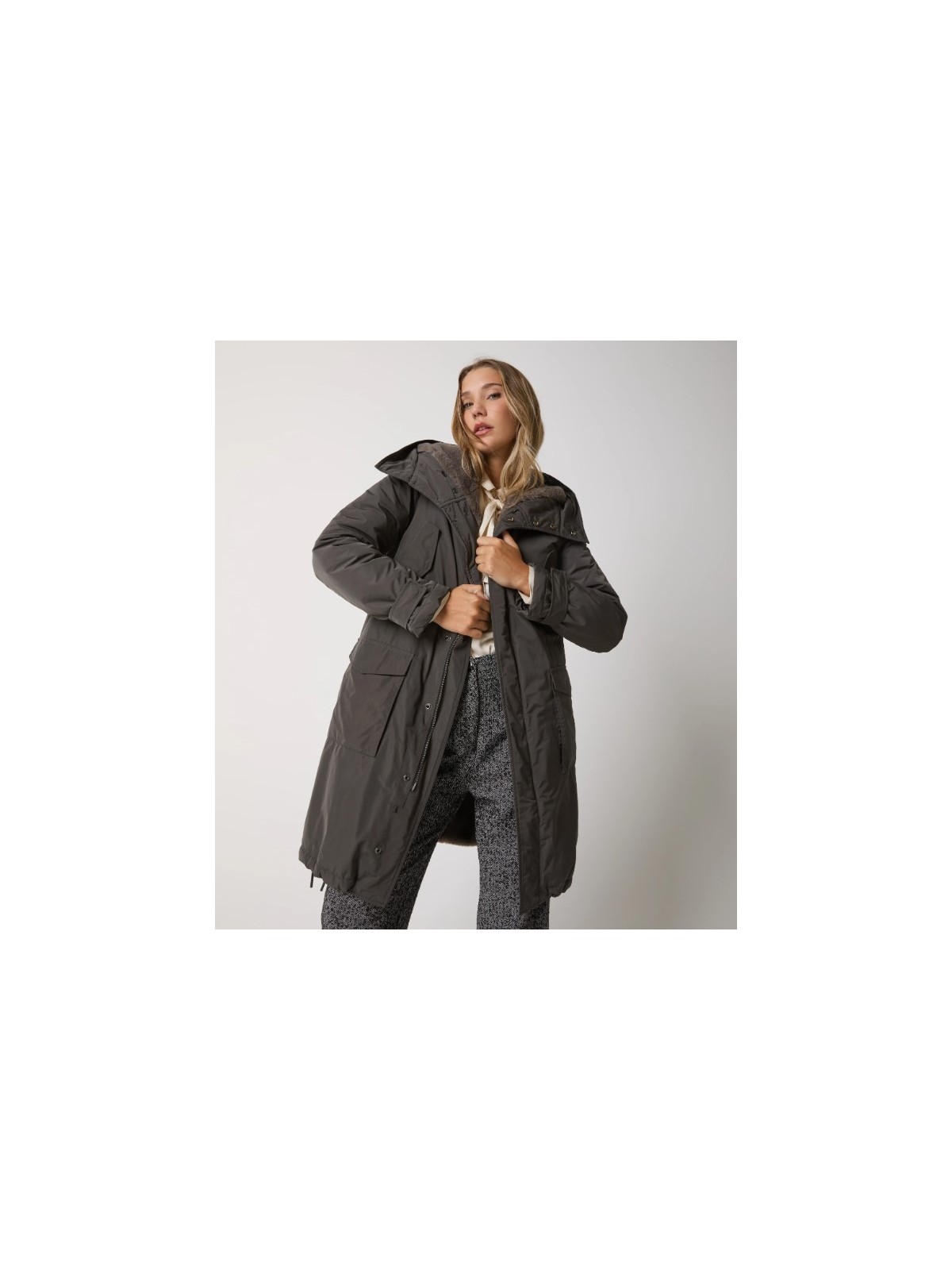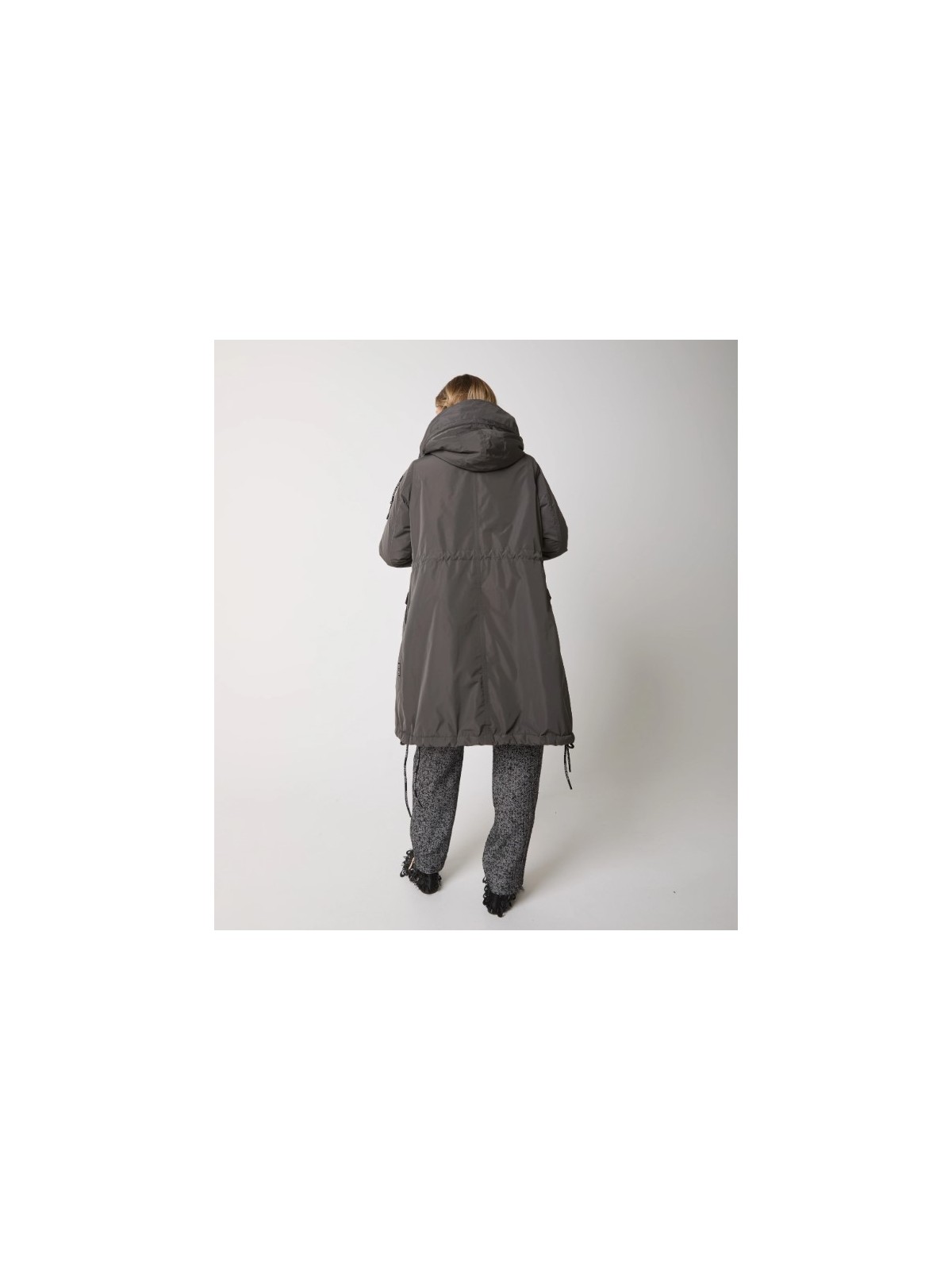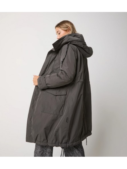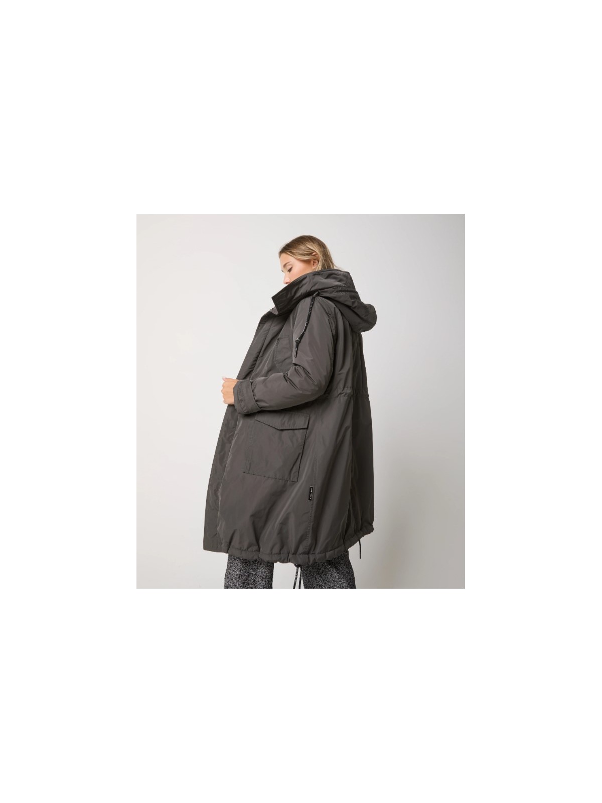 Il modello ha cappuccio regolabile con coulisse, tasche con patta, chiusura con zip e bottoni a pressione. Per un urban look moderno e raffinato.