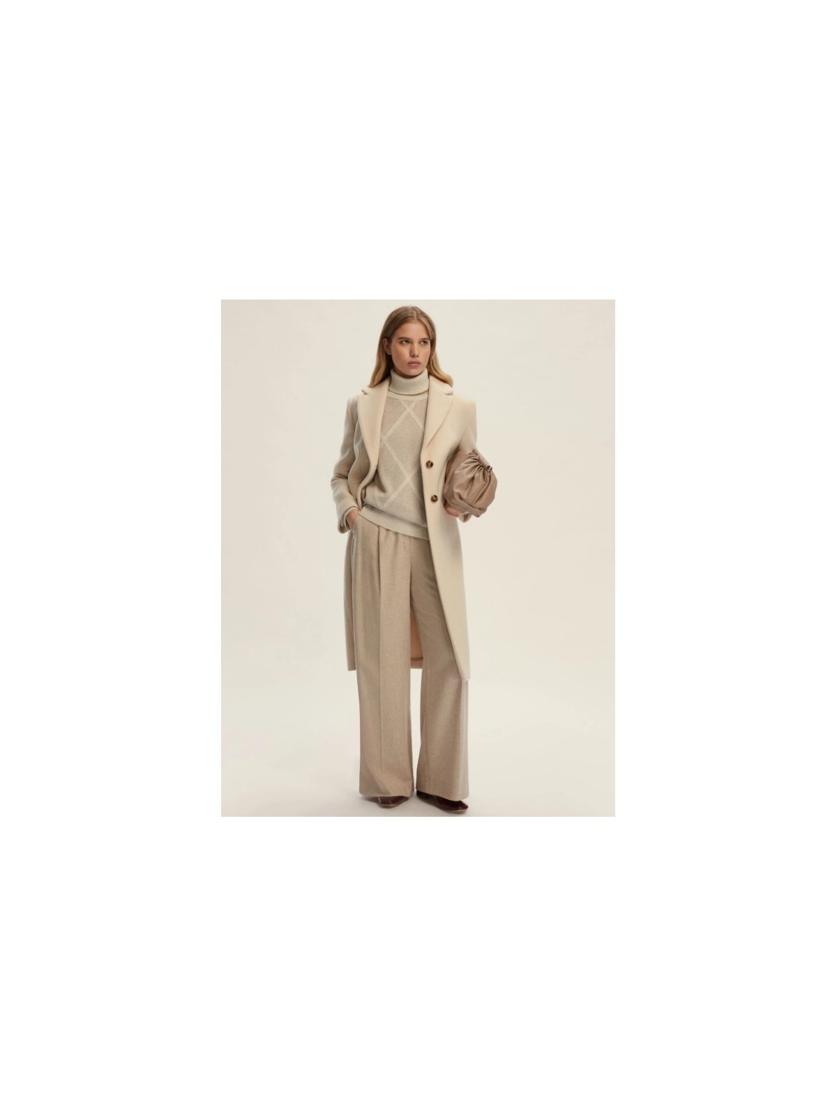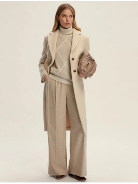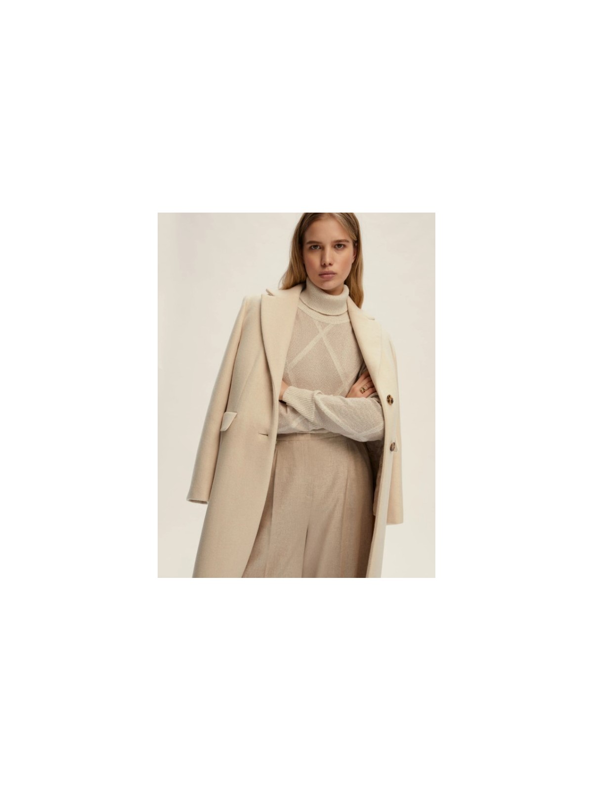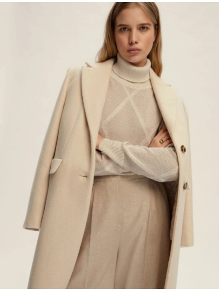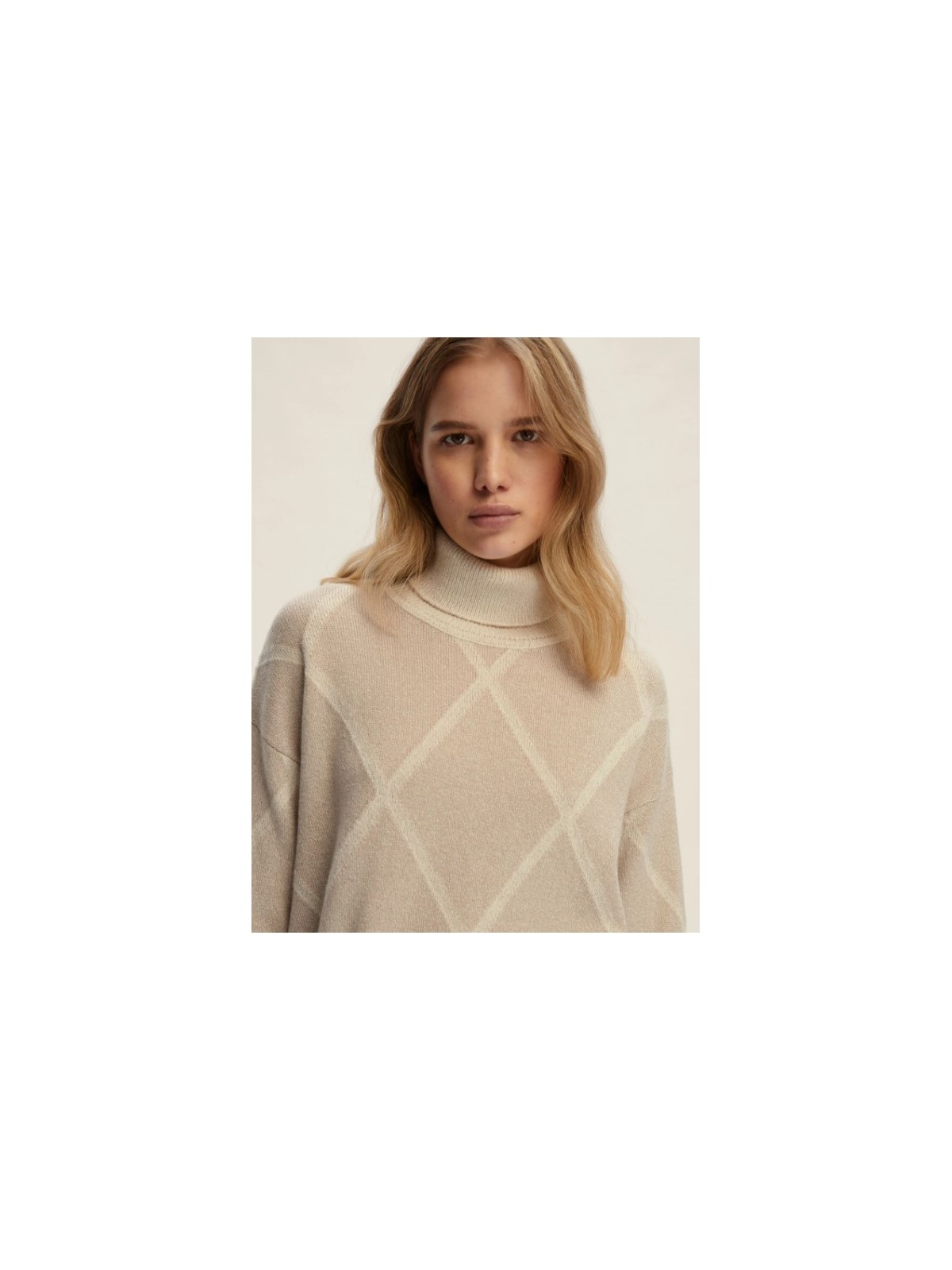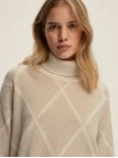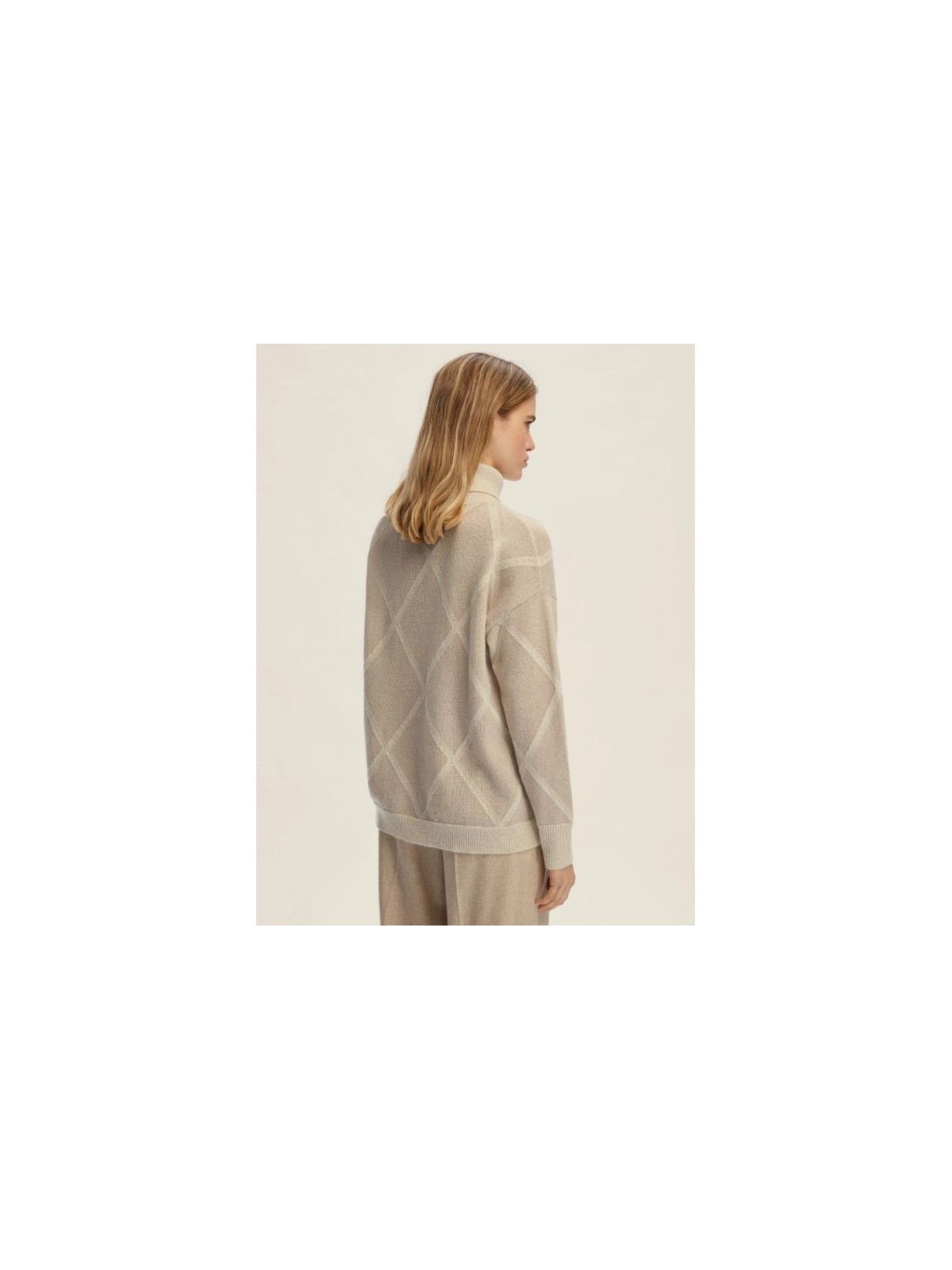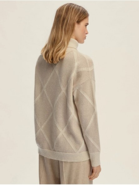 Grafica e avvolgente, la maglia in filato mouliné con lurex gioca con un motivo a rombi bicolore che accende il look con un twist luminoso. Il fit oversize e il collo alto creano volumi contemporanei, da completare con pantaloni essenziali o gonne fluide.