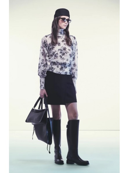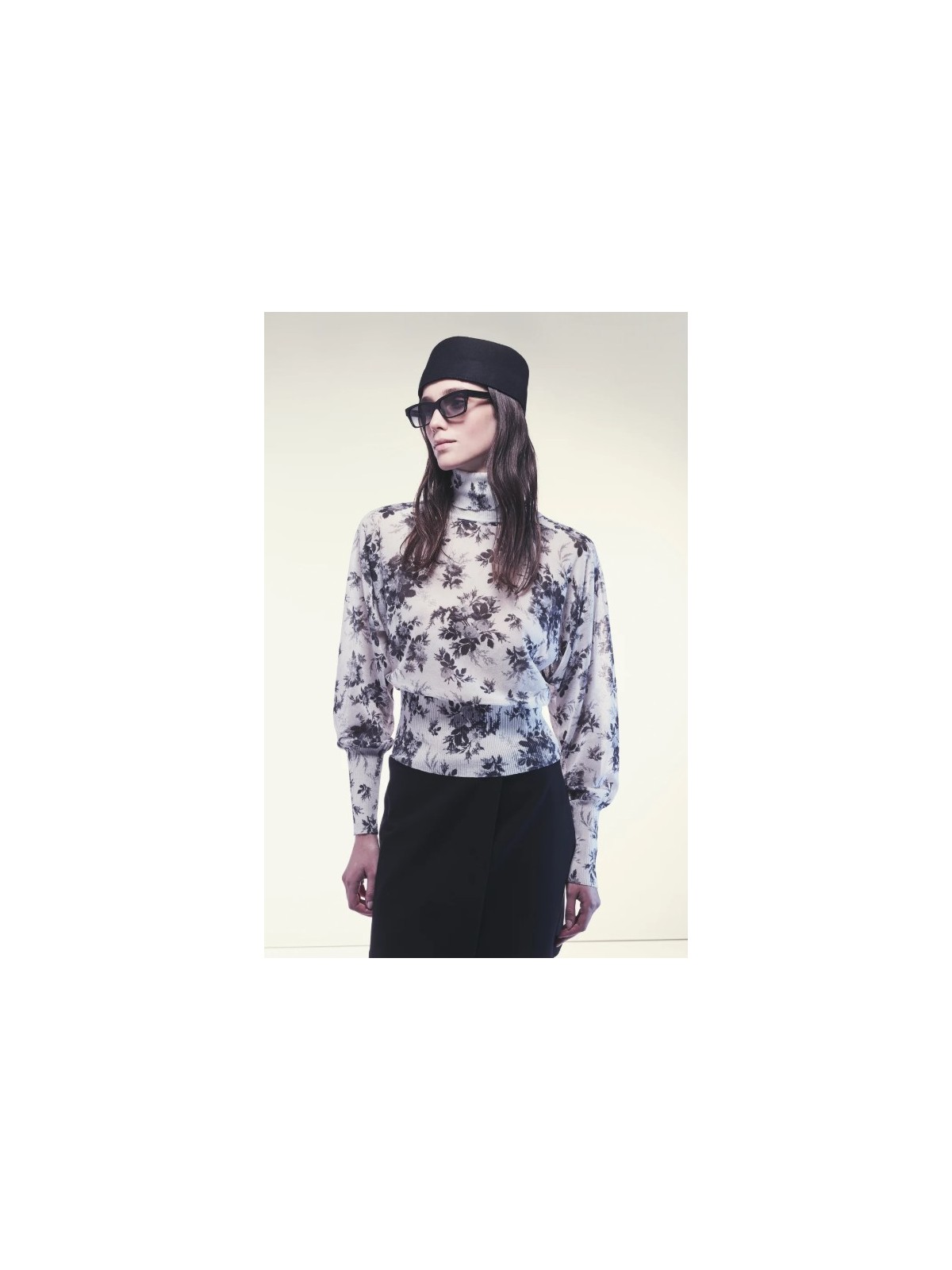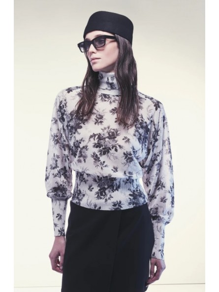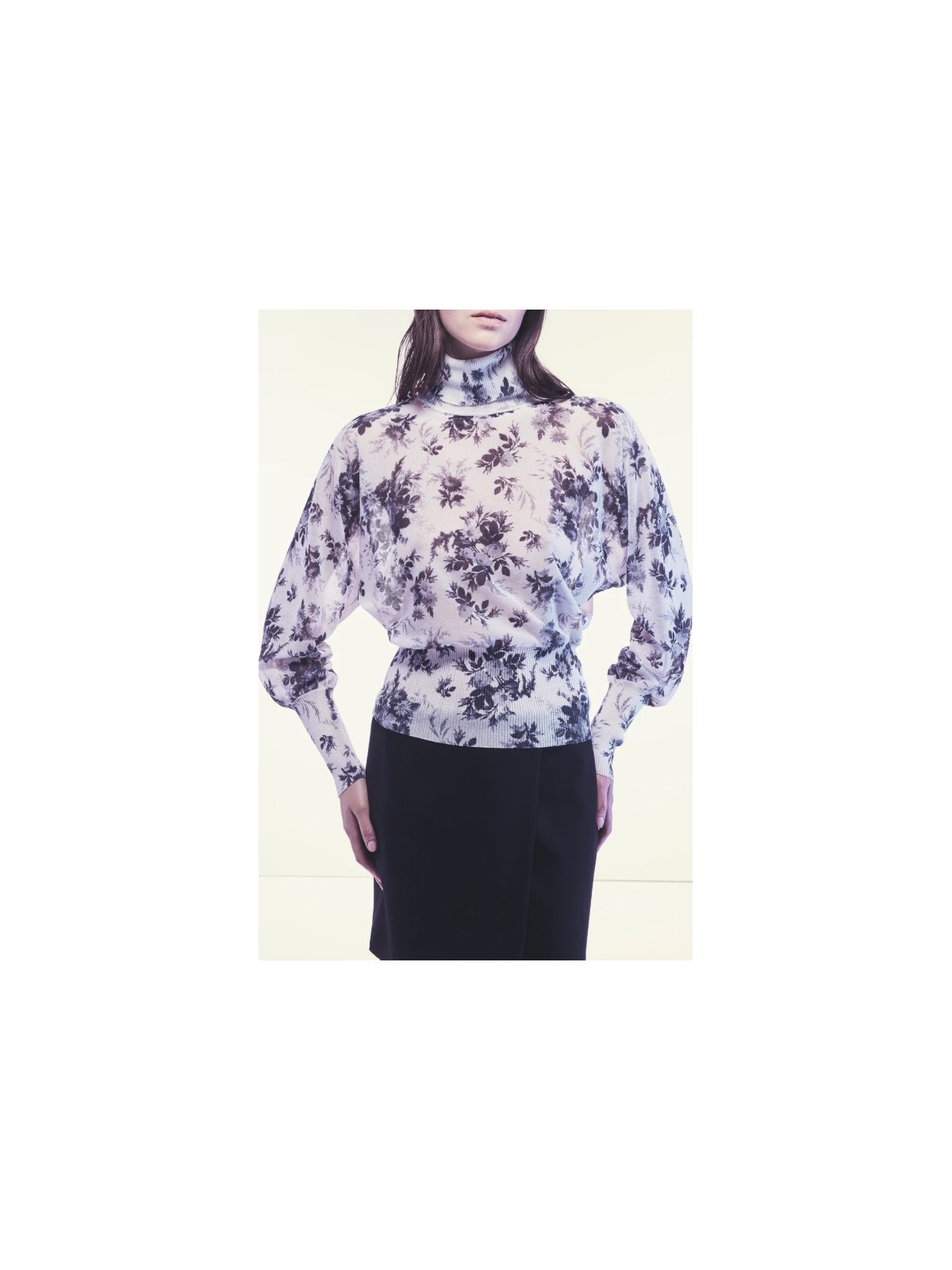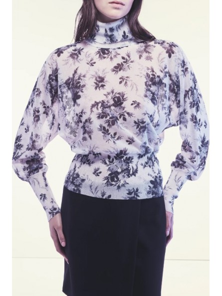 MAGLIA IN COTONE TECNICO STAMPATO DALLA LINEA MORBIDA CON COLLO ALTO E MANICHE LUNGHE A PIPISTRELLO CON POLSINI ADERENTI. STAMPA FLOREALE ALL-OVER IN CONTRASTO COLORE, TESSUTO LEGGERMENTE TRASPARENTE. ORLO ELASTICIZZATO ADERENTE E LUNGHEZZA REGOLARE AI FIANCHI.