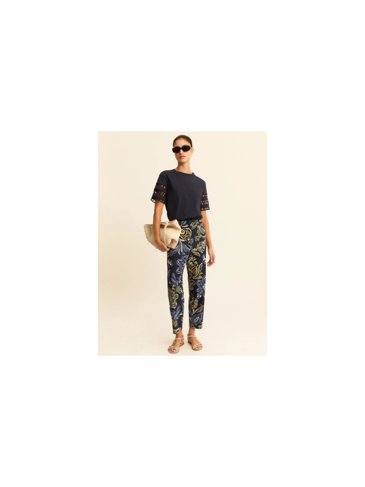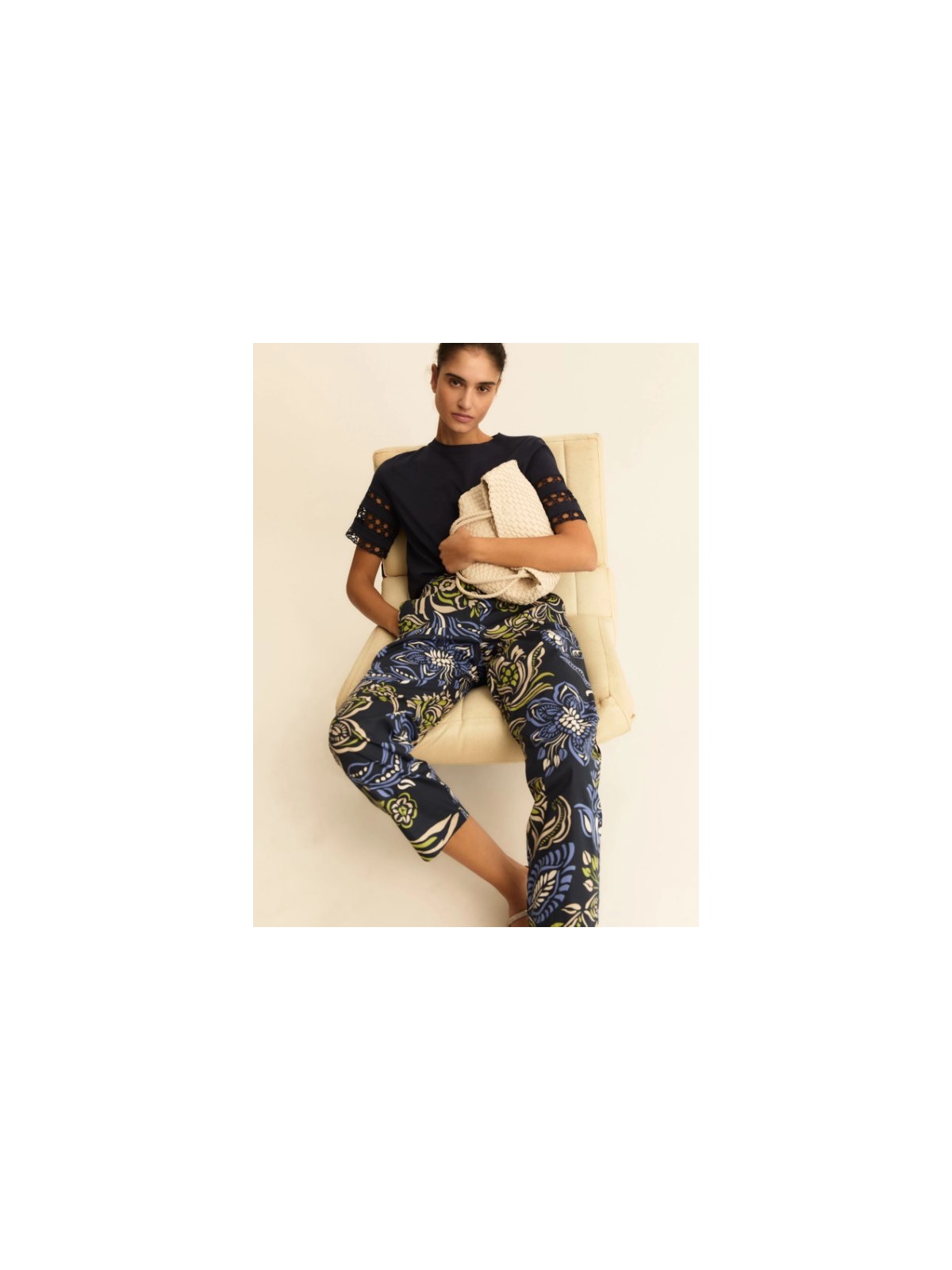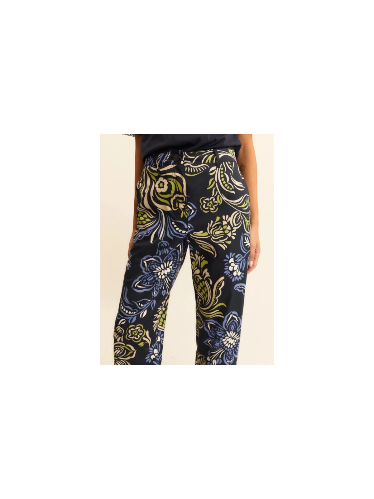L'intramontabile chino, in versione estiva: il cotone è fresco e leggero, con una nota stretch in trama per accompagnare il movimento. La baschina sagomata posteriore segue le forme e regala una linea femminile.