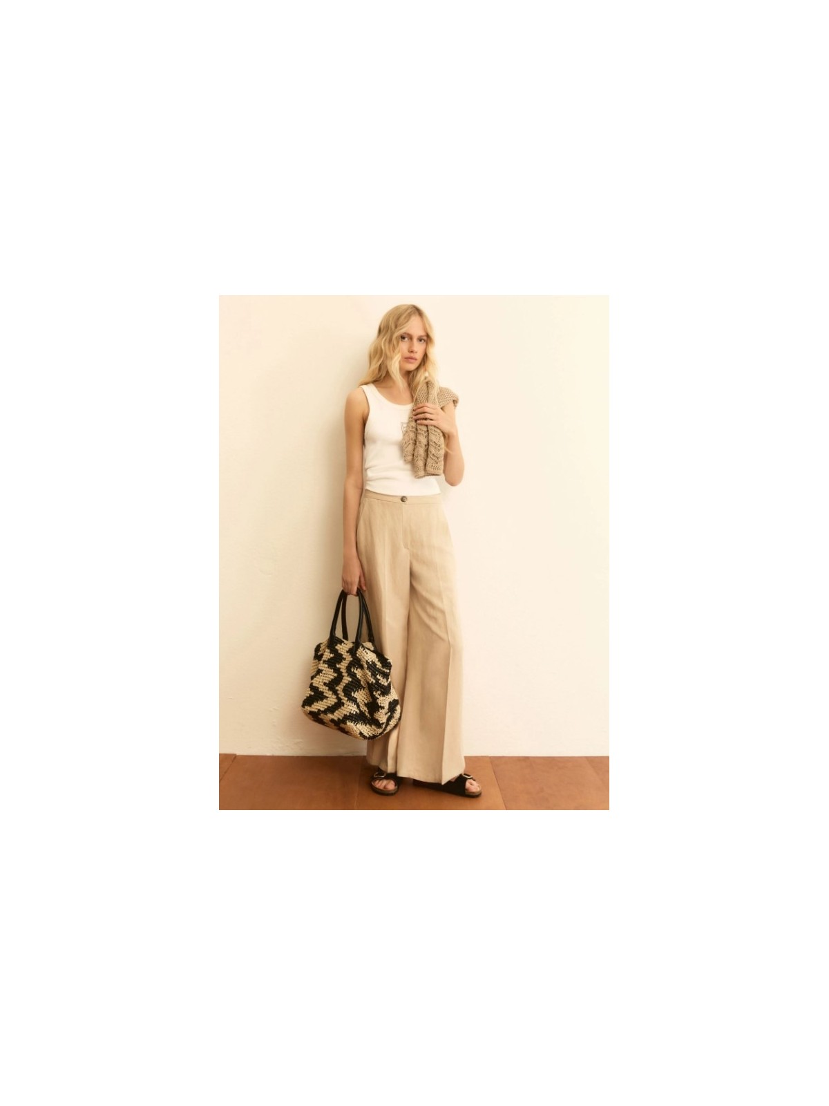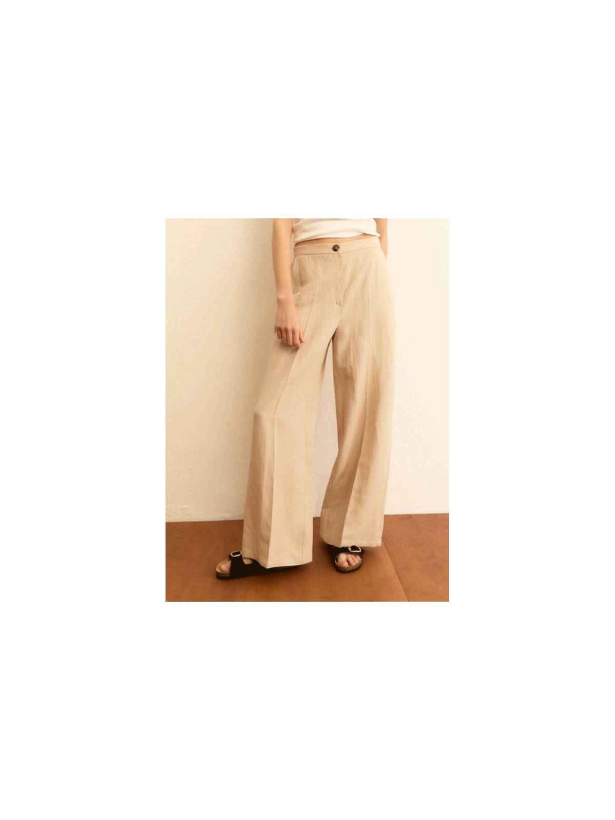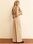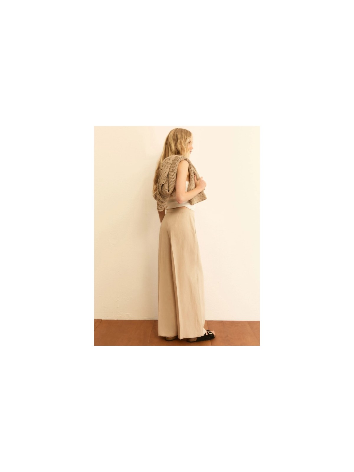 Volume ampio e tessuto fluido: il pantalone estivo per eccellenza mixa lino e viscosa, con un taglio di ispirazione sartoriale perfetto per l'ufficio o le giornate in città.