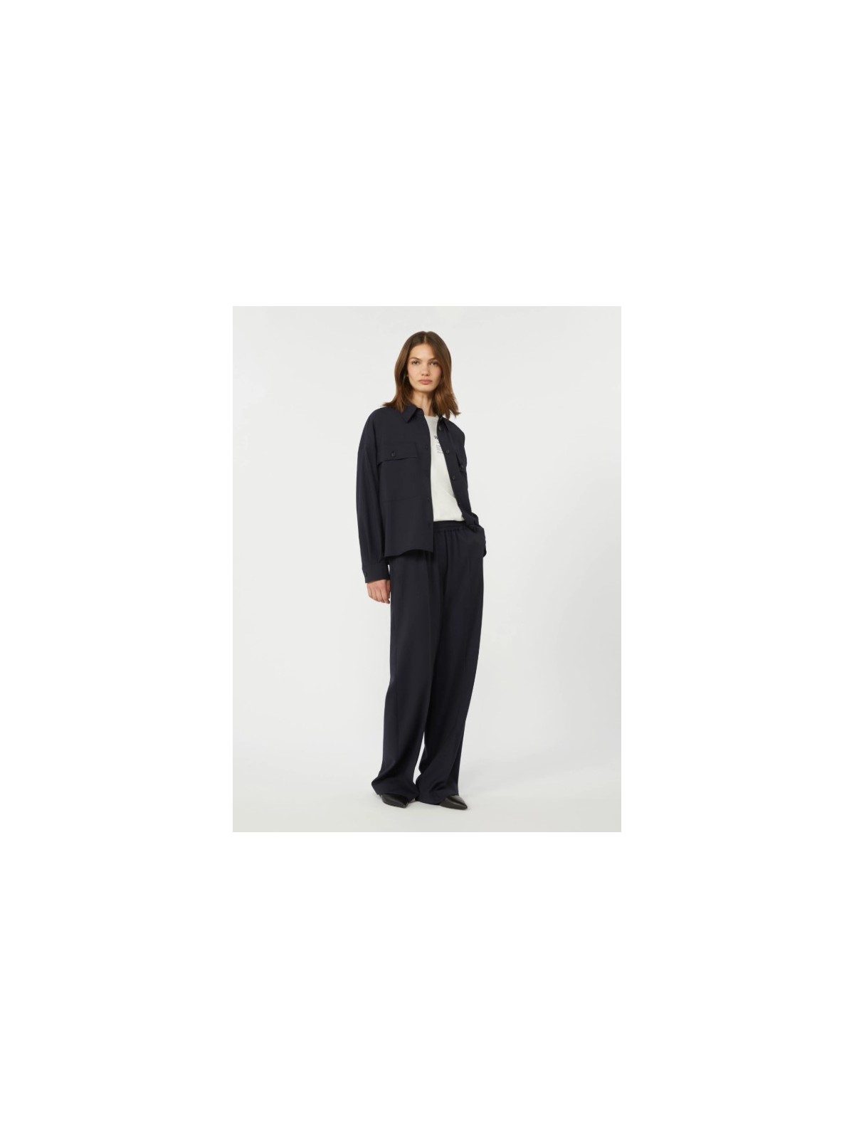 Pantalone straight leg con vita elasticizzata e coulisse interna per regolare la vestibilità.