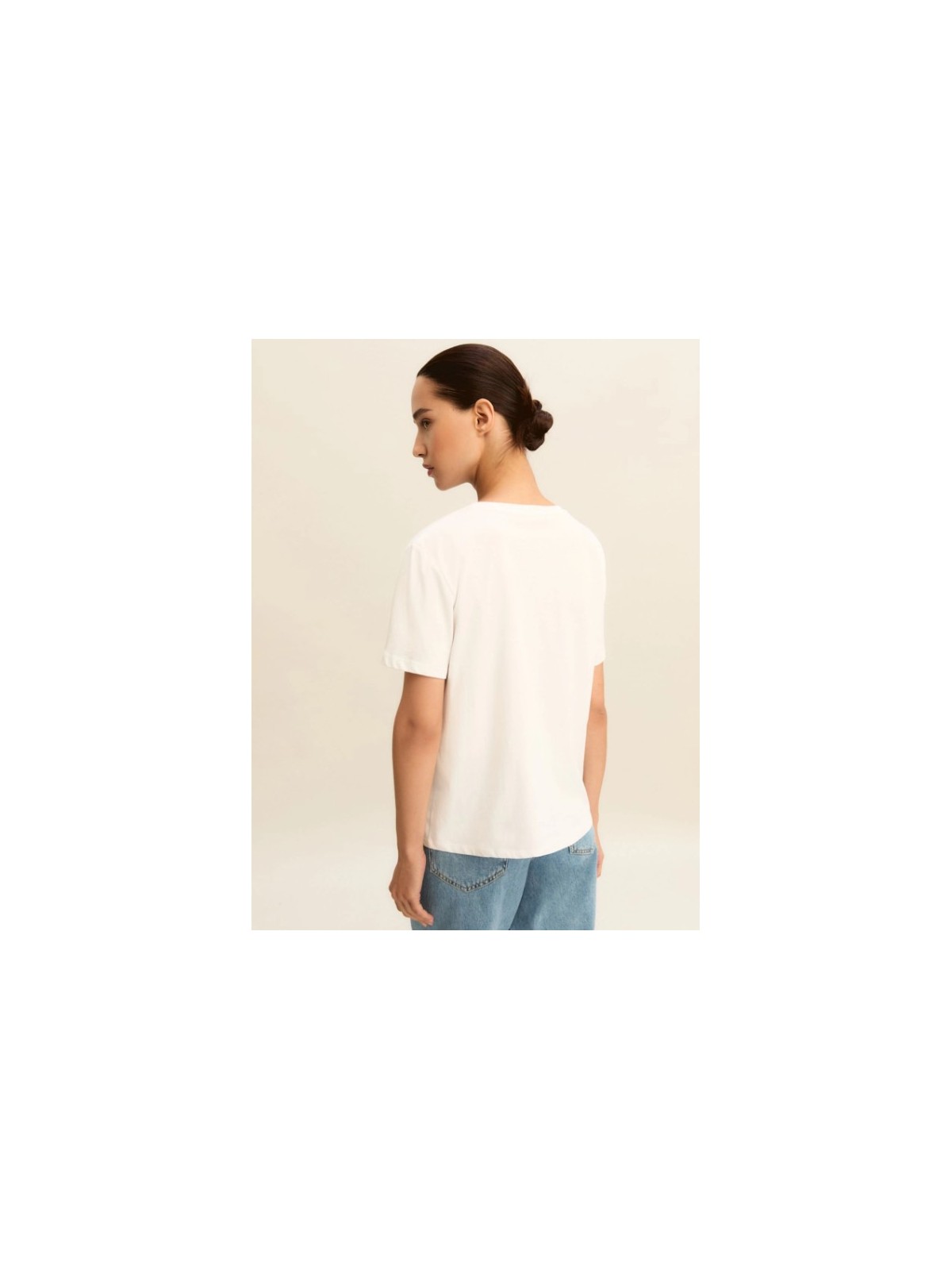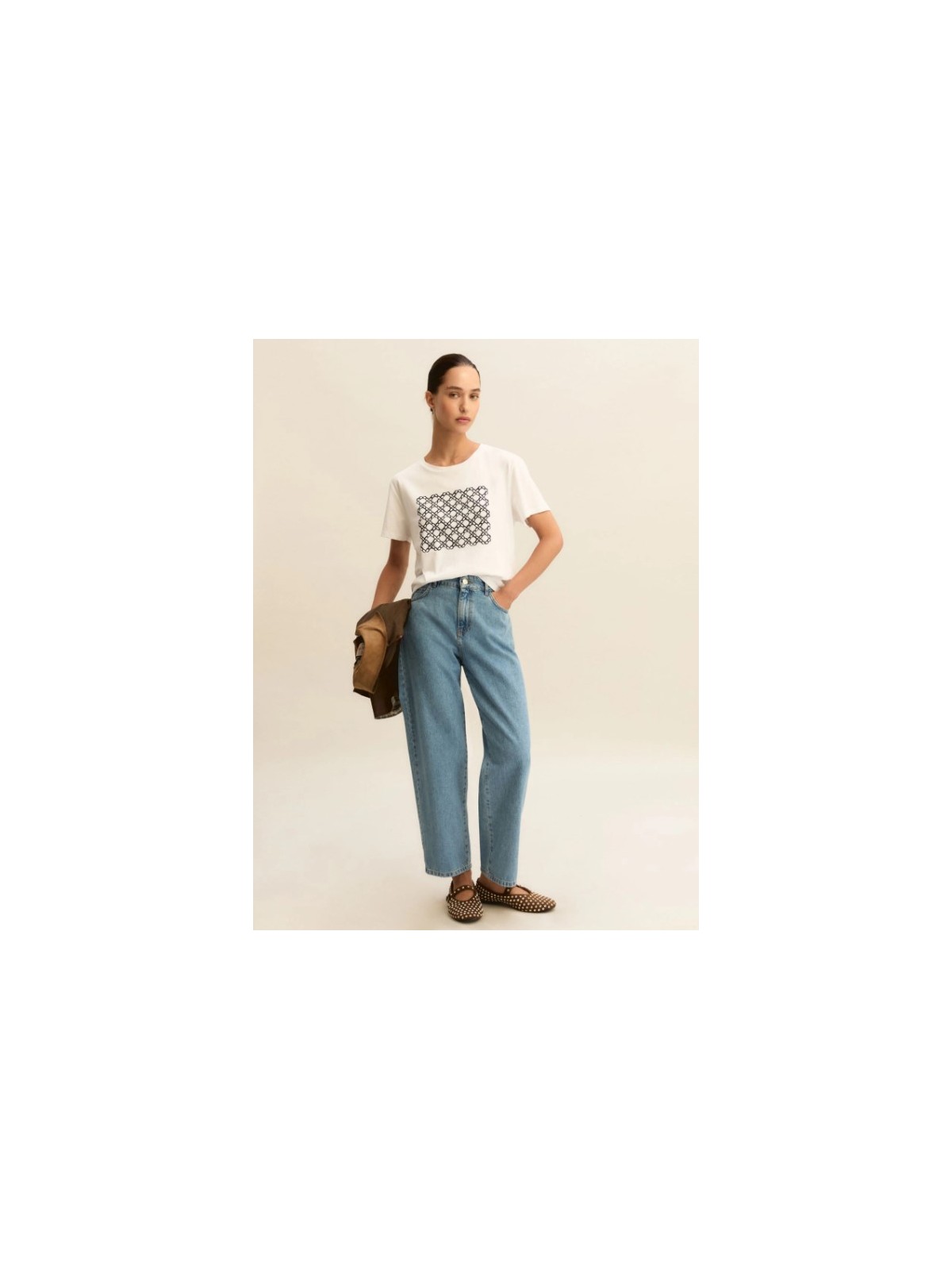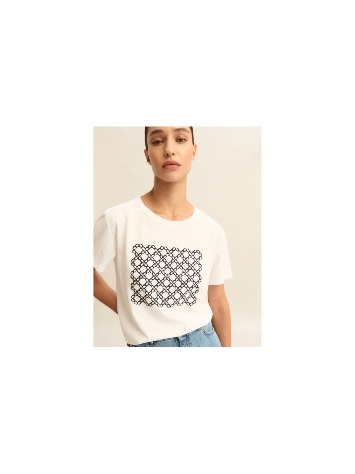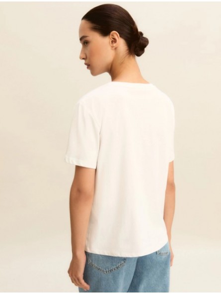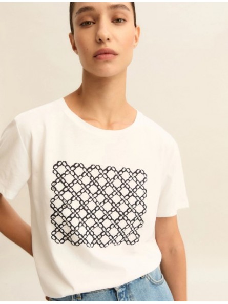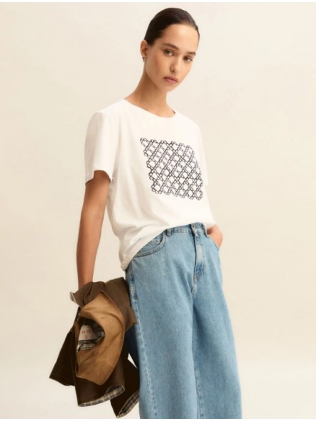 Pilastro del guardaroba estivo, la t-shirt in puro cotone è decorata da una stampa fantasia sul davanti. Perfetta sotto un blazer morbido, si abbina ai pantaloni fluidi di collezione o ai denim preferiti.